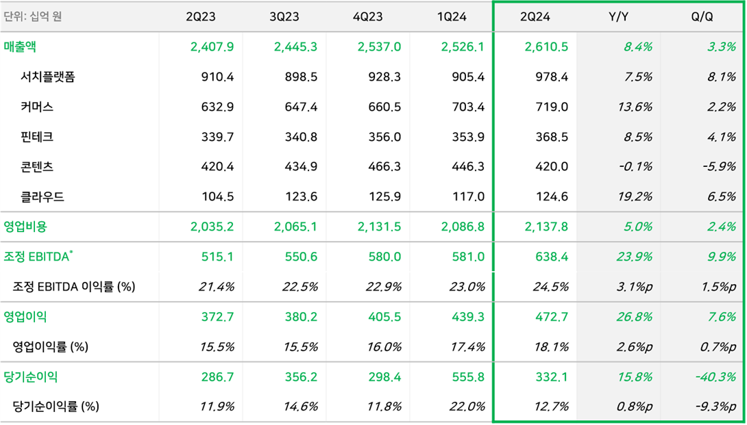 2분기 연결 매출액은 서치플랫폼, 커머스, 핀테크 등 주요 사업 부문의 고른 성장과 클라우드 매출 증대로 전년동기 대비 8.4%, 전분기 대비 3.3% 증가한 2조 6,105억 원을 기록했다. 조정 EBITDA는 전년동기 대비 23.9%, 전분기 대비 9.9% 증가한 6,384억 원으로 사상 최대 규모를 달성했다. 연결 영업이익은 전년동기 대비 26.8%, 전분기 대비 7.6% 성장한 4,727억 원으로, 18.1%의 영업이익률을 기록했다.