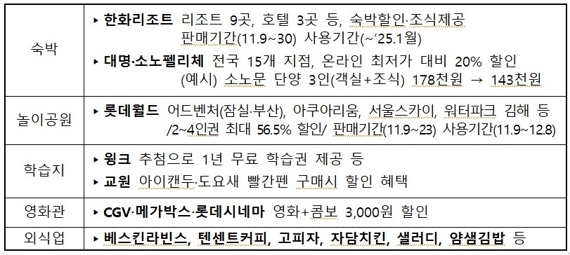 문화·레저 분야는 지난해 영화관 3사의 참여에 이어 올해는 한화리조트·대명소노펠리체 등 숙박업계, 롯데월드 등 놀이공원, 교원·윙크 등 학습지 업계가 신규로 참여했으며, 외식업계의 참여도 증가하고 있다.