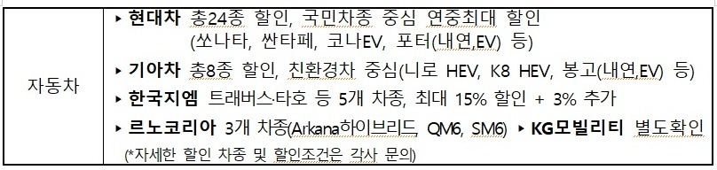 특히, 내수판매가 부진한 자동차 업계는 국민차종, 친환경차 등을 중심으로 높은 할인에 나섰다.