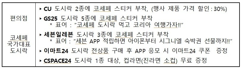 편의점 5개 사는 ‘코세페 국가대표 도시락’을 출시해 바쁜 직장인과 주머니가 가벼운 학생이 주로 찾는 4000~6000원 사이의 가성비 상품을 내놨으며 구매 후 QR코드 스캔 때 경품 증정 이벤트 등을 추진한다.