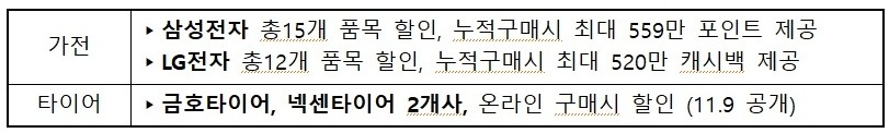 삼성전자는 15개 품목, LG전자는 12개 품목을 대상으로 하며 품목당 할인율을 전년보다 크게 높였고, 다품목 구매 때 우대해 신혼가전, 이사가전 구매에 도움이 될 것으로 기대된다.