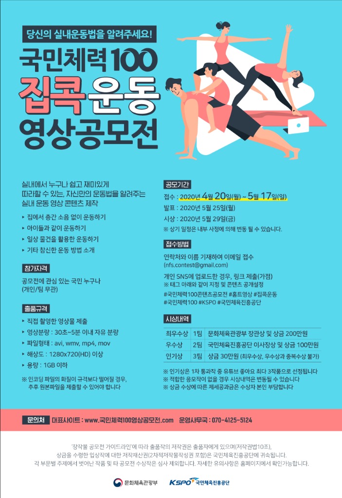 4월 20일(월)부터 5월 17일(일)까지 ‘집콕운동’을 주제로 대국민 영상 공모전도 열린다. 국민 누구나 ‘집에서 층간소음 없이 운동하기’, ‘아이들과 같이 운동하기’, ‘일상의 물건을 활용한 운동하기’ 등을 촬영한 ‘실내운동’ 영상을 누리소통망을 통해 공모하면 된다.