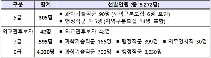 2025년도 국가공무원 공채시험 선발인원은 5272명으로, 직급별 선발인원은 5급 공채 305명, 외교관후보자 42명, 7급 공채 595명, 9급 공채 4330명을 확정했다.