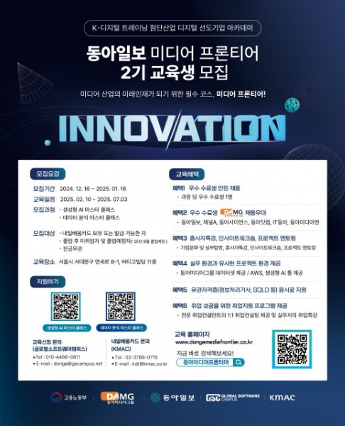 2기 교육은 오는 2월 10일부터 7월 3일까지 글로벌소프트웨어캠퍼스 신촌센터에서 오프라인으로 진행된다. 참여를 희망하는 교육생은 동아일보 미디어 프론티어 부트캠프 공식 홈페이지를 통해 오는 16일까지 신청 가능하며, 서류심사와 역량 및 면접 평가를 거쳐 최종 합격자를 발표한다.