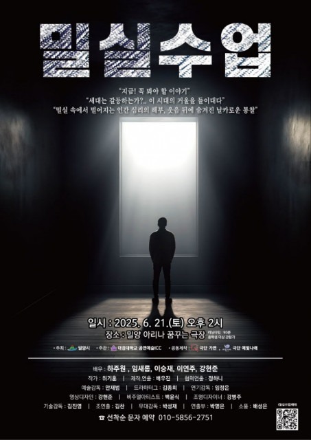 이번 공연은 대경대학교 연극영화과 배우진 교수가 제작·연출을 맡아 ‘세대 간의 갈등’이라는 키워드를 중심으로 우리가 살아가는 삶을 거울처럼 비춰주는 무대를 선보인다. 웃음 뒤에 숨겨진 불편한 진실, 침묵 뒤에 자리한 절실한 외침을 보여준다. ‘밀실수업’은 지금 이 시대에 꼭 필요한 연극으로, 위기훈 작가의 대표작 중 하나로 평가받고 있다.