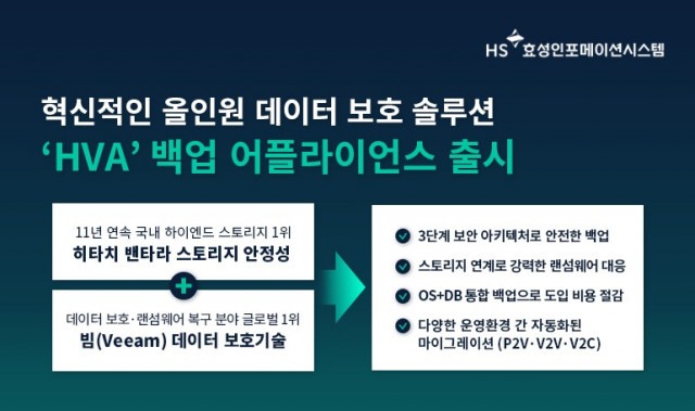AI·데이터 인프라 솔루션 전문기업 HS효성인포메이션시스템이 히타치 밴타라의 고성능 인프라와 데이터 보호 및 랜섬웨어 복구 분야 글로벌 선도기업 빔 소프트웨어의 기술을 결합한 차세대 통합 백업 어플라이언스 ‘HVA (Hitachi Veeam Appliance)’를 출시했다.