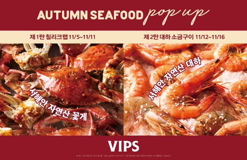 빕스의 어텀 시푸드 팝업은 메뉴에 따라 두 차례로 나뉘어 운영된다. 5일부터 11일까지 칠리크랩을 선보이고, 12일부터는 대하 소금구이로 전환되어 16일까지 운영된다. 단, 제철 식재 특성상 한정 수량으로 운영돼 재료 소진 시 조기 종료될 수 있다.
