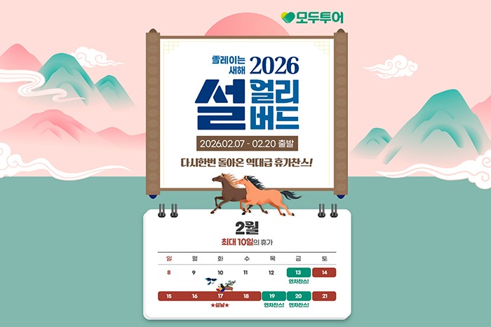 모두투어는 2026년 설 연휴 여행 수요 증가에 발맞춰 ‘2026 설 얼리버드’ 기획전을 론칭하고, 최대 9일간의 황금연휴를 활용할 수 있는 다양한 인기 여행 상품을 선보인다고 27일 밝혔다.