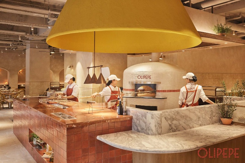 올리페페 매장은 광화문 청계한국빌딩 2층에 약 170평, 156석 규모로 조성됐다. 매장 내부는 이탈리아 거리 풍경에서 영감을 얻어 현지 건축 요소를 모던하게 재해석해 따뜻하고 경쾌한 분위기를 구현했다. 매장 중앙의 피자 화덕과 오픈형 주방에서는 나폴리 피자협회의 인증을 받은 ‘카푸토 밀가루’로 매일 직접 도우를 만들고, 풍성한 토핑을 얹어 구워내는 과정을 시각적으로 생동감 있게 전달한다. 청계천이 내려다 보이는 창가 좌석부터 부스석, 바 좌석, 단체룸까지 다양한 좌석을 마련해 방문 목적에 맞는 편안한 이용이 가능하다.