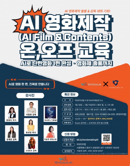 위데이터랩와 한국AI마케팅연구소는 2026년 1월 19일부터 2월 11일까지 서울 종로구 수운회관 위데이터랩 교육장에서 ‘글로벌 AI 영화제 출품을 위한 ‘AI FILM & CONTENTS’ 영화 제작 온·오프라인 교육’을 운영한다.