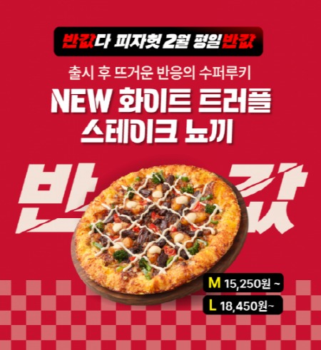 2월 평일 반값 혜택 대상 피자로는 피자헛 40주년을 기념하며 출시된 스페셜 메뉴 ‘화이트 트러플 스테이크 뇨끼’가 선정됐다. ‘화이트 트러플 스테이크 뇨끼’는 향긋한 화이트 트러플 오일과 부드러운 스테이크, 쫄깃한 뇨끼 등 고급 식재료의 환상적인 조화로 입안 가득 고급스러운 풍미를 선사하며 다이닝 수준의 미식 경험을 제공하는 프리미엄 피자다.