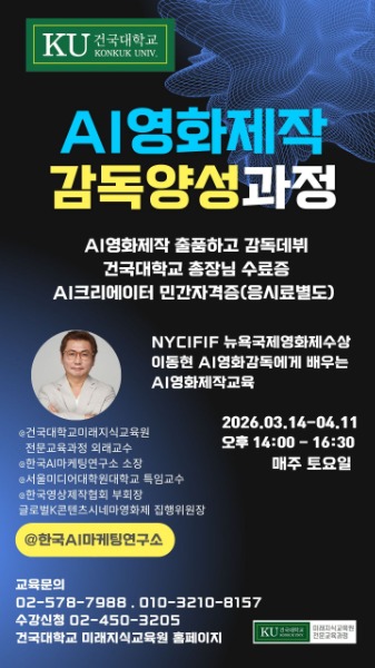건국대학교 미래지식교육원은 오는 3월 14일부터 4월 11일까지 매주 토요일 총 5주간 ‘AI영화감독양성과정 3기’를 개설하고 수강생을 모집한다고 밝혔다.