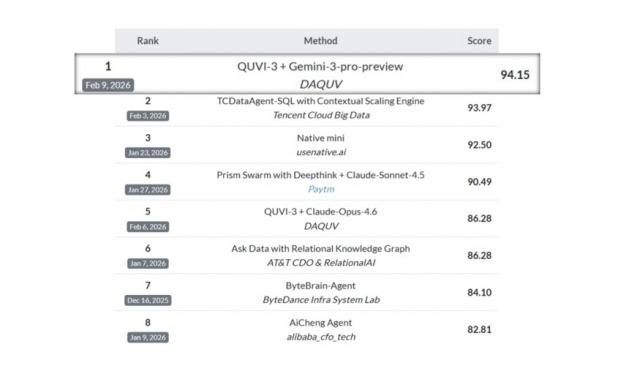 AI 전문기업 다큐브는 미국 예일대(Yale) 연구진이 주도하는 세계 최고 권위의 Text-to-SQL(자연어-데이터 변환) 벤치마크인 ‘Spider 2.0’에서 평가 대상인 3개 트랙(DBT·Lite·Snow) 모두 세계 1위를 석권했다고 11일 밝혔다. 중국 텐센트는 다큐브에 이어 2위를 차지했다.