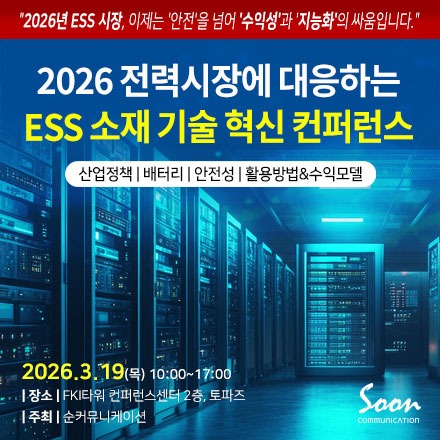 순커뮤니케이션(www.sooncom.co.kr)은 3월 19일(목) 여의도 FKI타워 컨퍼런스센터 2층 토파즈 룸에서 ‘2026 AI전력시장에 대응하는 ESS 기술 혁신 컨퍼런스’를 개최한다.