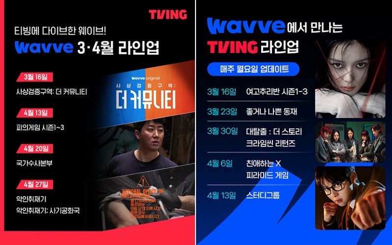 웨이브 역시 제3회 청룡시리즈어워즈 최우수작품상을 수상한 ‘사상검증구역: 더 커뮤니티’와 서바이벌 예능 ‘피의 게임’ 시즌 1~3 등 플랫폼을 대표하는 오리지널 콘텐츠들을 티빙에 공급한다.
