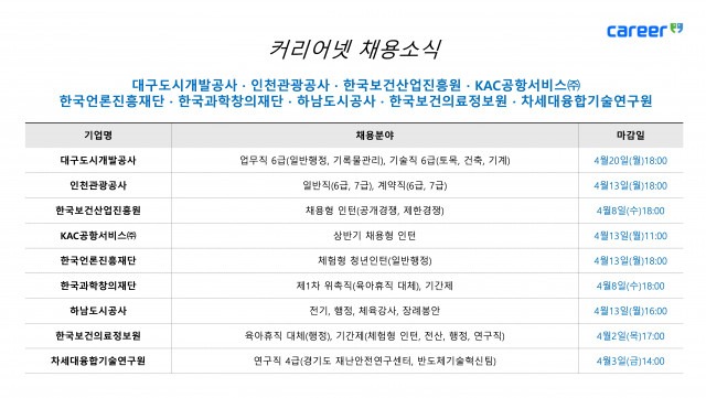 취업 포털 커리어넷이 대구도시개발공사, 인천관광공사, 한국보건산업진흥원, KAC공항서비스, 한국언론진흥재단, 한국과학창의재단, 하남도시공사, 한국보건의료정보원, 차세대융합기술연구원 등의 채용 소식을 2일 발표했다.