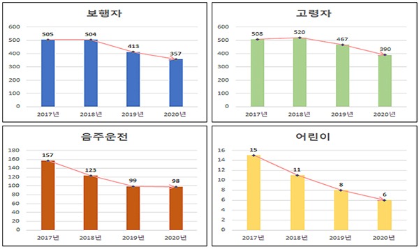 사망자 유형별로 살펴보면 보행자는 지난해 1~4월 413명에서 357명으로 13.6% 줄었다. 만 65세 이상 고령자는 476명에서 390명으로 18.1%, 만 13세 미만 어린이는 8명에서 6명으로 25%, 음주운전은 99명에서 98명으로 1% 감소했다.