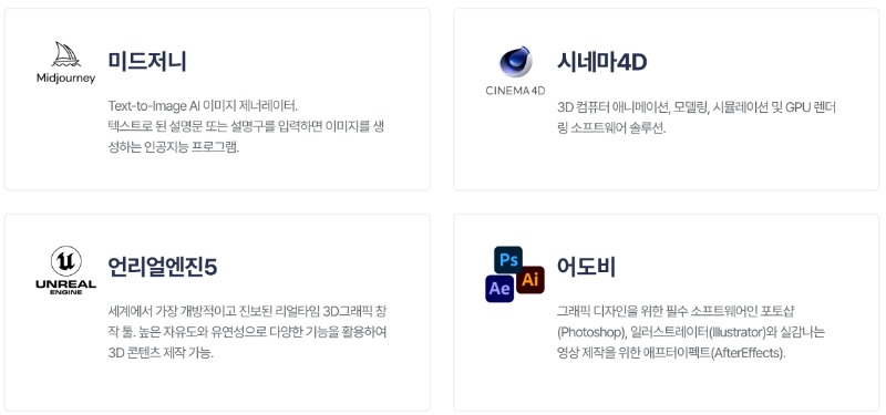 주요 사용 프로그램은 미드저니, 시네마4D, 언리얼엔진5, 포토샵, 일러스트레이터, 애프터이펙트 등이다. 교육 내용은 스토리텔링과 AI 기획, 시네마4D 기본, 언리얼 그래픽 기본, 리얼리티캡처 기본, 언리얼엔진 기본 및 그래픽 응용, 언리얼엔진 심화, 시네마틱 3D 미디어 아트 프로젝트, 시네마틱 3D 미디어 엔지니어링 프로젝트 등으로 구성돼 있다.