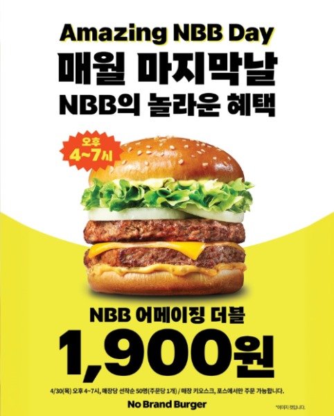 24일 노브랜드 버거는 매월 마지막 날 대표 메뉴를 합리적인 가격에 선보이는 ‘어메이징 NBB 데이’ 2회차 행사를 진행한다고 밝혔다. 이달 행사에서는 오는 30일 오후 4시부터 7시까지 전국 노브랜드 버거 매장에서 선착순 50명을 대상으로 ‘NBB 어메이징 더블’ 단품을 1900원에 판매한다. 정상가(4500원) 대비 58% 할인된 가격이다.