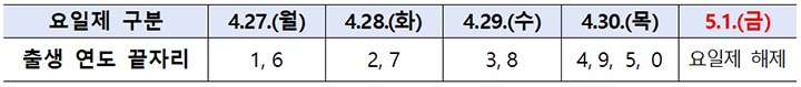 1차 신청은 27일 오전 9시부터 5월 8일 오후 6시까지 진행된다. 신청 첫 주에는 혼잡을 방지하기 위해 출생 연도 끝자리를 기준으로 한 요일제가 적용된다. 다만, 5월 1일 노동절이 공휴일임을 고려해 4월 30일에는 끝자리가 4, 9인 대상자뿐만 아니라 5, 0인 대상자도 신청이 가능하다. 1차 기간 내 신청하지 못한 대상자는 5월 18일부터 7월 3일까지 진행되는 2차 기간에 신청할 수 있다.