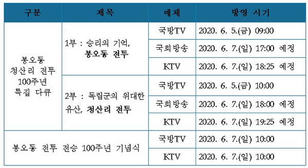 이 프로그램은 5일 오전 9시부터 국방TV에서 방영하고, 이후 7일에는 국회방송과 KTV 국민방송에서 재방영한다. 또한 7일 오전 10시에는 국방TV와 KTV에서 ‘봉오동 전투 전승 100주년 기념식’을 생중계할 예정이다.