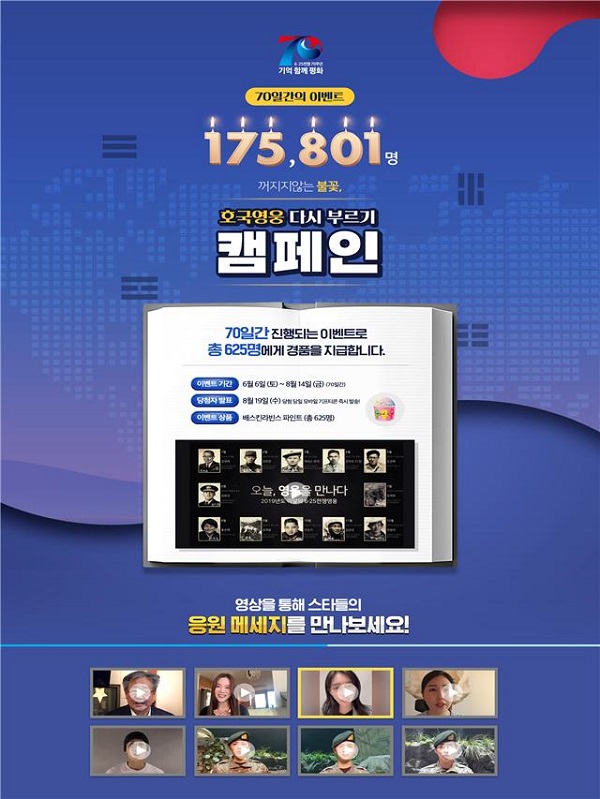 6·25전쟁 70주년 사업추진위원회는 9일 ‘호국 영웅 다시 부르기’ 온라인 롤콜 캠페인을 6일부터 8월 14일까지 70일간 진행한다고 밝혔다.