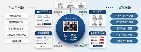 이에 따라 인사처는 포스트 코로나 시대를 대비해 실시간 화상교육 등 비대면 학습을 활성화하고, 공무원이 민간의 우수한 콘텐츠 등에 손쉽게 접근하며 자신에게 꼭 필요한 교육을 추천받을 수 있는 플랫폼 구축을 추진하게 되었다.