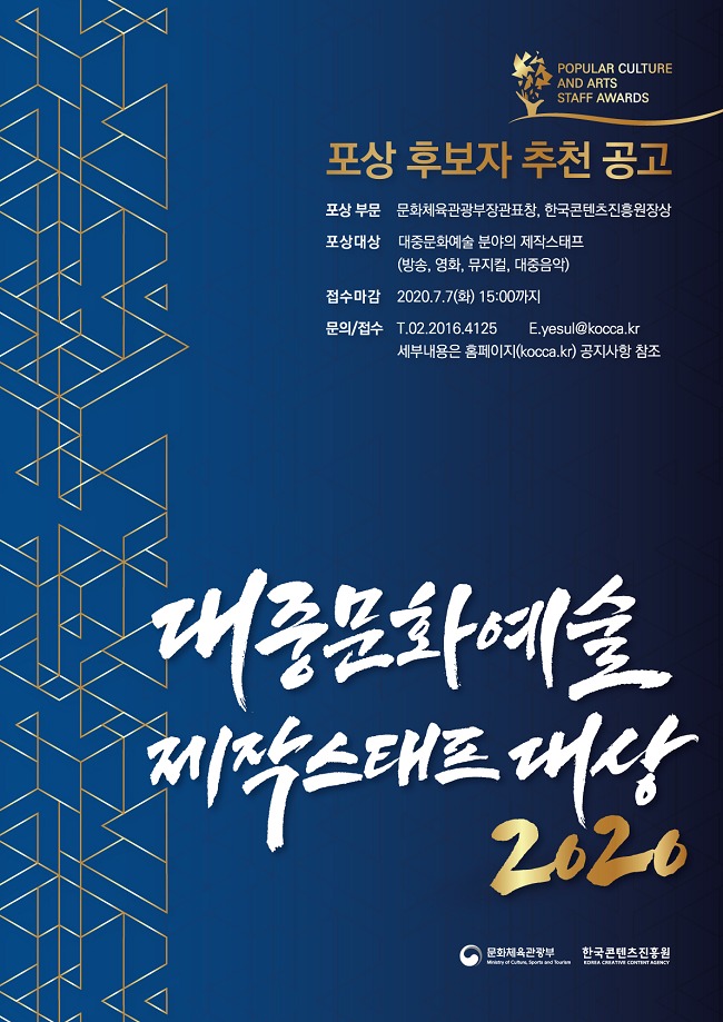 문화체육관광부와 한국콘텐츠진흥원(이하 콘진원)은 ‘2020 대중문화예술 제작스태프 대상’ 포상 후보자를 오는 7월 7일까지 추천받는다.