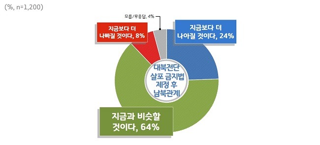 향후 남북관계에 대해서는 ‘더 나빠질 것’(25%)이라는 의견과 ‘더 나아질 것’(21%)이라는 전망이 엇갈리는 가운데, ‘지금과 비슷할 것’이란 의견은 50%로 나타났다. 이는 2018년 4월 판문점선언 직후 조사한 남북관계 전망(‘지금보다 나아질 것’ 73%, ‘지금과 비슷할 것’ 18%, ‘지금보다 나빠질 것’ 4%)과 큰 차이를 보였다.