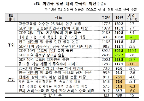 한국은 2019년 기준 종합혁신지수에서 EU 회원국 평균을 100으로 했을 때 134점으로 8년째 글로벌 경쟁국 중 가장 높은 점수를 받았다. 우리나라에 이어 캐나다(122), 호주(111), 일본(102), 미국(96), 중국(92) 등이 뒤따랐다.