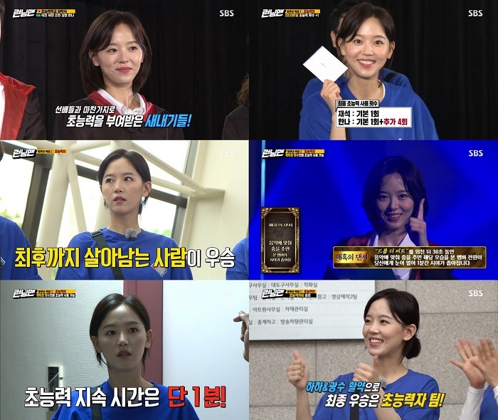 레이스가 시작되고 초능력 사용의 스타터가 된 강한나는 “드랍 더 비트”라는 주문을 외친 뒤 귀여운 댄스로 능력을 발휘했다. 이를 본 멤버들의 시야가 좁아지자 그중 지석진의 이름표를 뜯은 강한나는 “짐 보따리 벗고 편하게 쉬세요”라는 말로 웃음을 자아냈다.