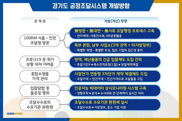 이런 문제를 해결하기 위해 경기도는 지난 3월부터 자치행정국에 공정조달태스크포스(T/F)팀을 신설해 자체 조달시스템 개발․운영 계획을 추진 중이다.