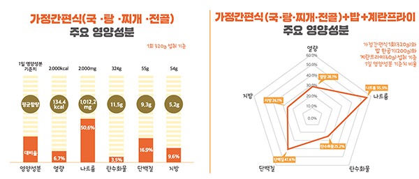 아울러 가정간편식을 먹을 때는 부족한 열량과 단백질 등을 보충해주는 식품(예: 계란프라이)을 함께 섭취하고, 몸 속 나트륨 배출에 도움을 주는 칼륨 함량 많은 파·양파 등을 함께 조리해서 나트륨 섭취를 조절하는 것이 바람직하다.