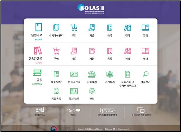 KOLASⅢ는 공공도서관 자료관리 선진화를 위해 지난 1992년 도스 기반으로 개발돼 현재까지 지속적인 기능개선을 통해 1900여 개 도서관에 보급돼 있는 관리시스템이다.