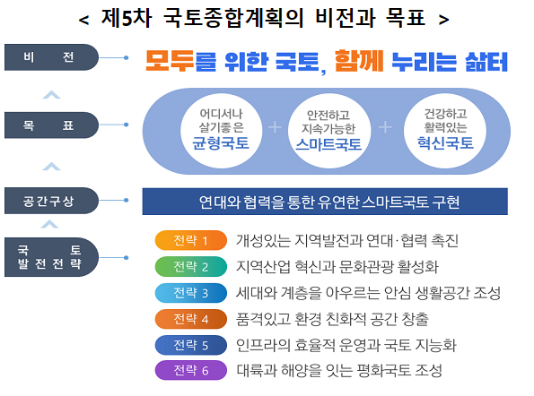 제5차 국토종합계획은 국토기본법 제9조에 근거한 최상위 공간계획으로 지난해 말 국무회의 심의, 대통령 승인을 거쳐 확정됐다. 실천계획은 이를 구체화하고 소관 기관별로 추진계획을 담는 후속조치다.