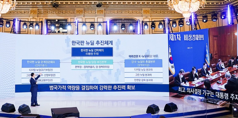 특히 “한국판 뉴딜은 대한민국 새로운 100년의 설계”라고 강조하며 “튼튼한 고용·사회안전망을 토대로 디지털 뉴딜과 그린 뉴딜을 두 축으로 세워 세계사적 흐름을 앞서가는 선도국가로 나아가겠다”고 말했다.