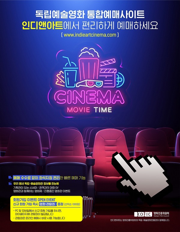 영화진흥위원회(위원장 오석근)는 오늘 7월 15일 독립예술영화전용관 통합예매서비스 ‘인디앤아트’사이트(www.indieartcinema.com)를 오픈한다.