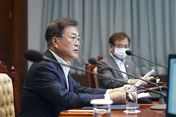 문 대통령은 이어 한국판 뉴딜과 관련, “정부는 새로운 국가 발전 전략으로 한국판 뉴딜을 추진하며 단일 국가 프로젝트로서는 사상 최대 규모의 재정 투자 계획을 발표했다”며 “반드시 대한민국 대전환을 이루겠다는 정부의 강력한 의지”라고 강조했다.
