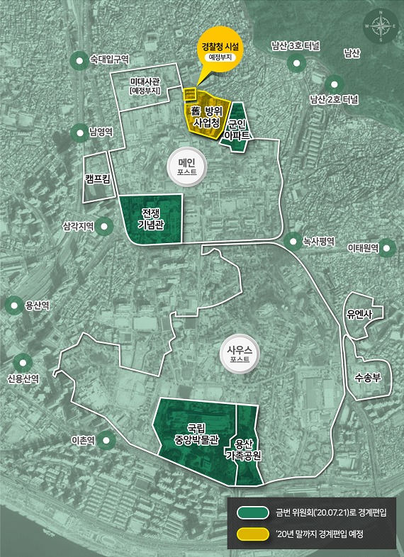 서울 용산 미군기지 옆 옛 방위사업청 부지로 옮길 예정이었던 경찰청 시설이 용산 정비창 정비 지역으로 이전하면서 해당 부지는 용산공원 내로 편입된다.