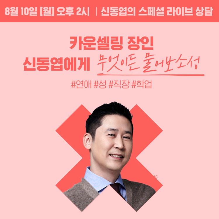 ‘신동엽의 성선설’을 기획, 제작 중인 SM CCC LAB은 오늘(10일) 오후 2시 신동엽과 함께 스페셜 라이브 방송을 진행한다고 밝혔다. 이번 방송에서는 지난 3일부터 시작한 ‘#무엇이든 물어보소성’ 이벤트를 통해 공모받은 연애, 직장, 학업 등 다양한 주제의 고민들을 상담해줄 예정이다.