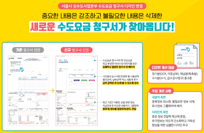 서울시 상수도사업본부는 2015년 수도요금 청구서 개편 이후 5년 만에 청구서 디자인을 개선했다고 13일 밝혔다.