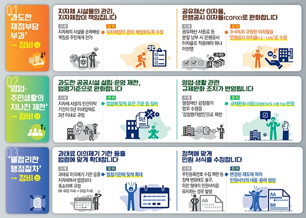 가령 법령에 근거없이 전통시장·노인회관 임차인이나 수도공사 대행업자에게 보증금 등을 예치하도록 규정하는 경우가 있었는데, 이에 사용료·임대료 외에 부당한 보증금 예치 규정을 삭제하도록 했다.