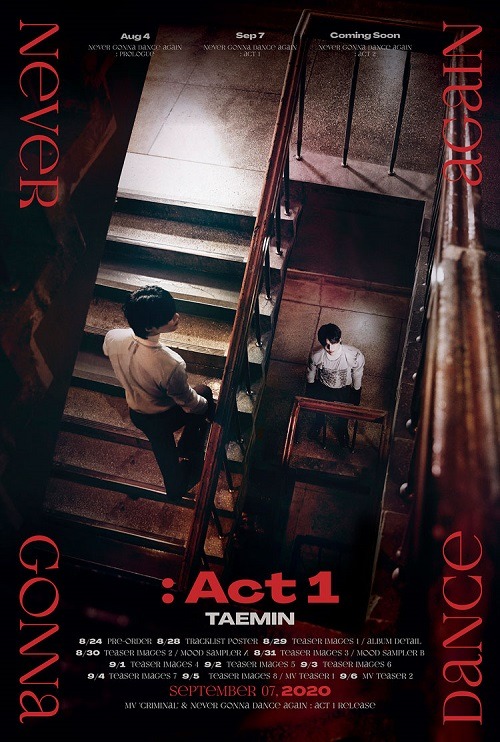 태민 정규 3집 ‘Never Gonna Dance Again : Act 1’(네버 고나 댄스 어게인 : 액트 1, 이하 Act 1)은 9월 7일 발매되며, 타이틀 곡 ‘Criminal’(크리미널)을 비롯해 다채로운 매력의 총 9곡이 수록되어 있어 음악 팬들의 뜨거운 관심을 얻을 전망이다.