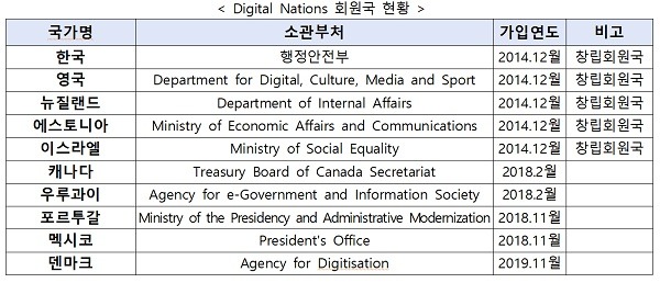 우리나라는 올해 OECD 디지털정부 평가 종합 1위, UN 전자정부 평가 온라인 서비스 지수 1위 등을 달성하고 ICT 기술을 적극 활용한 K-방역이 세계적으로 주목을 받으면서 높아진 한국 디지털정부의 위상에 힘입어 2022년 디지털네이션스 의장국이 된다.