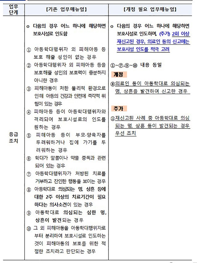 특히 두 번 이상 신고된 아동에게 멍이나 상흔이 발견되는 경우에는 72시간 동안 응급 분리하도록 지침에 명시했다.
