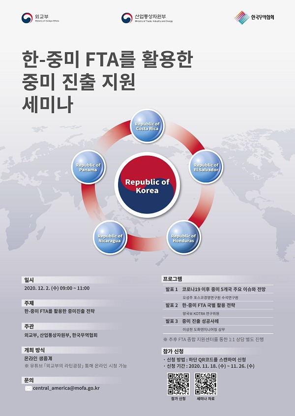 외교부, 산업통상자원부 및 한국무역협회는 공동으로 2020.12.2.(수) 09:00-11:00 신라호텔에서 ‘한-중미 자유무역협정[FTA]을 활용한 중미 진출 지원 세미나’를 개최한다.