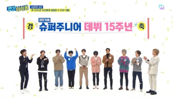 슈퍼주니어는 9일 오후 5시 MBC M, MBC 에브리원을 통해 방송된 ‘주간아이돌’에 출연, 데뷔 15주년을 기념한 축하 케이크와 함께 랜선 파티를 진행하는 등 시작부터 훈훈한 모습을 보여줬다.