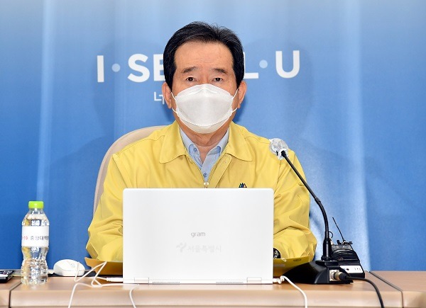 정세균 국무총리가 16일 오전 서울시청에서 코로나19 대응 중앙재난안전대책본부 회의를 주재하고 있다.