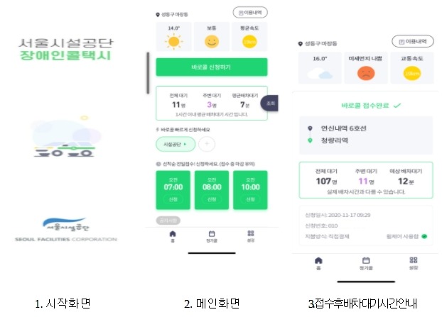 서울시와 시설공단은 장애인콜택시 기존 호출앱의 불편사항을 해결하기 위해 지난해 12월 신규 ‘장애인콜택시’ 앱을 출시하여 운영하고 있다. 주요 개선내용은 ▲예상배차 대기시간 제공, ▲등록절차 간소화, ▲보호자 계정등록으로, 장애인콜택시의 이용 접근성을 높였다.
